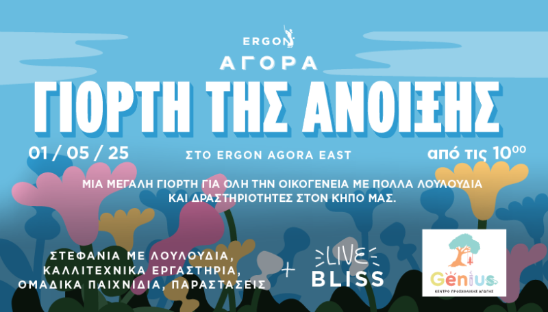 Την Πρωτομαγιά, την Πέμπτη 1 Μαΐου 2025, από τις 10.00 το πρωί, ο κήπος του Ergon Agora East στα Ανατολικά της Θεσσαλονίκης μεταμορφώνεται σε μια ανθισμένη γιορτή που υποδέχεται όλη την οικογένεια! Ένα ξεχωριστό event που γιορτάζει την άνοιξη με δημιουργικά εργαστήρια, ομαδικά παιχνίδια, live μουσική, παραστάσεις και πολλές εκπλήξεις, ακριβώς μπροστά στη θάλασσα. Ελάτε να ζήσετε μια αξέχαστη ημέρα γεμάτη χρώματα, γέλια και δημιουργία!