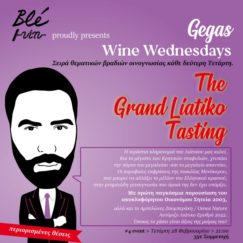 Tην Τετάρτη 28 Φεβρουαρίου, όπως και κάθε δεύτερη Τετάρτη, ο οινοκριτικός και σύμβουλος οίνου Παύλος Γκέγκας σε περιμένει για μία γευσιγνωσία υψηλής αισθητικής, ποιότητας και αξίας κρασιών. Αυτή τη φορά η βραδιά είναι αφιερωμένη στο Λιάτικο, την εμβληματική ποικιλία που καλλιεργείται κυρίως στην Κρήτη. Οι κορυφαίες εκφράσεις της ποικιλίας– Μονόκερου, που μπορεί να αλλάξει το μέλλον του Ελληνικού κρασιού, σε μία μνημειώδη γευσιγνωσία που όμοιά της δεν έχει υπάρξει!