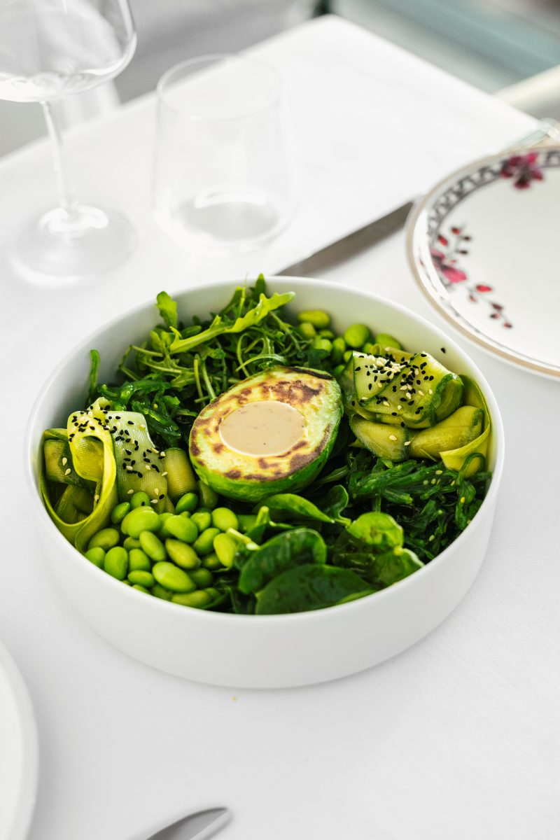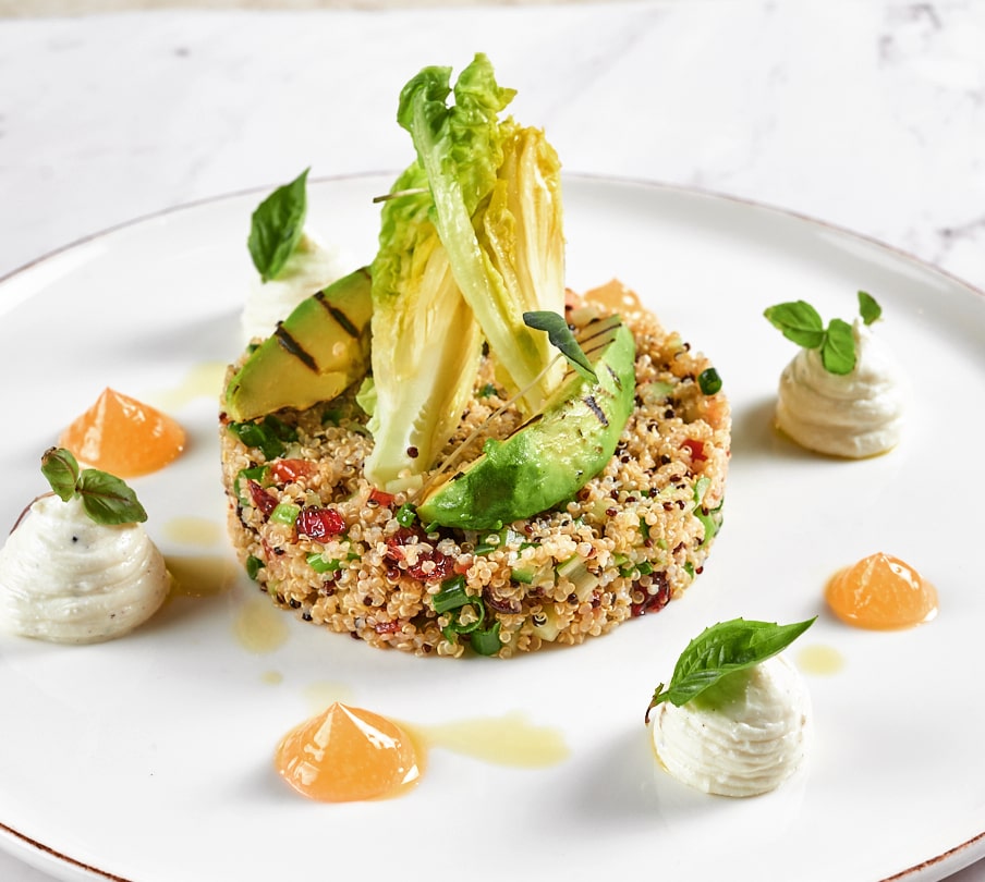 Τρίχρωμη κινόα με βινεγκρετ δυόσμου, ψιλοκομμένο φρέσκο κρεμμυδάκι, ψιλοκομμένο σχινόπρασο, ψιλοκομμένο αγγουράκι, ψιλοκομμενη τομάτα, cranberries, ψητό αβοκάντο και baby gem ( μαρούλι). Σερβίρεται με μαρμελάδα grapefruit και mouse από νιβατό Βερδικούσας.
