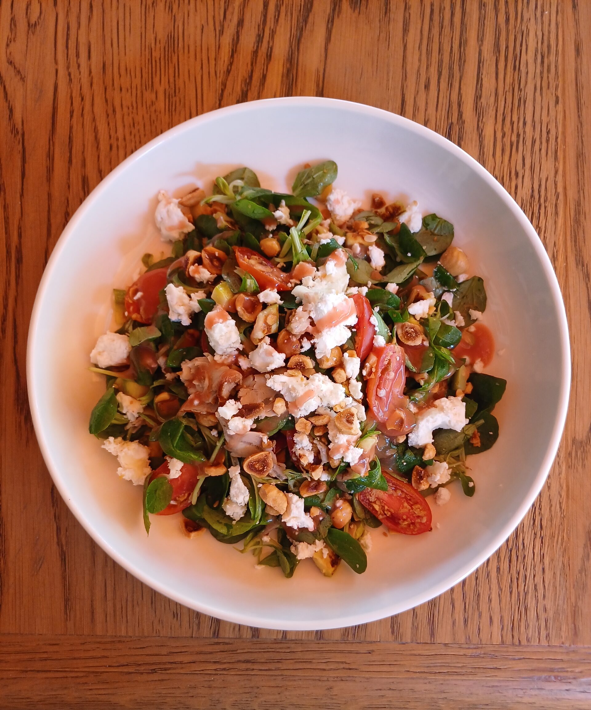 Σαλάτα Βαλεριάνα με chevre, κολοκυθάκι, τοματίνια, φουντούκια και dressing σμέουρου.
