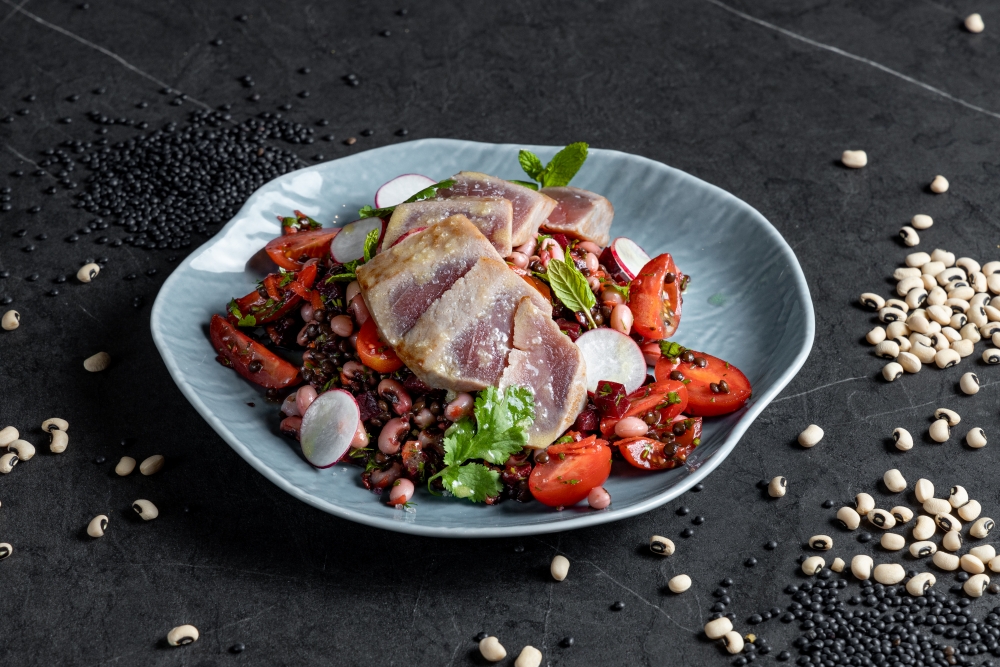 Pirate Skipjack. Η συγκεκριμένη σαλάτα περιλαμβάνει μαυρομάτικα φασόλια, φακές Beluga, παντζάρι, Καρότο, ντοματίνια, Elixir λεμονιού, βότανα και φυσικά φρέσκο φιλέτο τόνου.