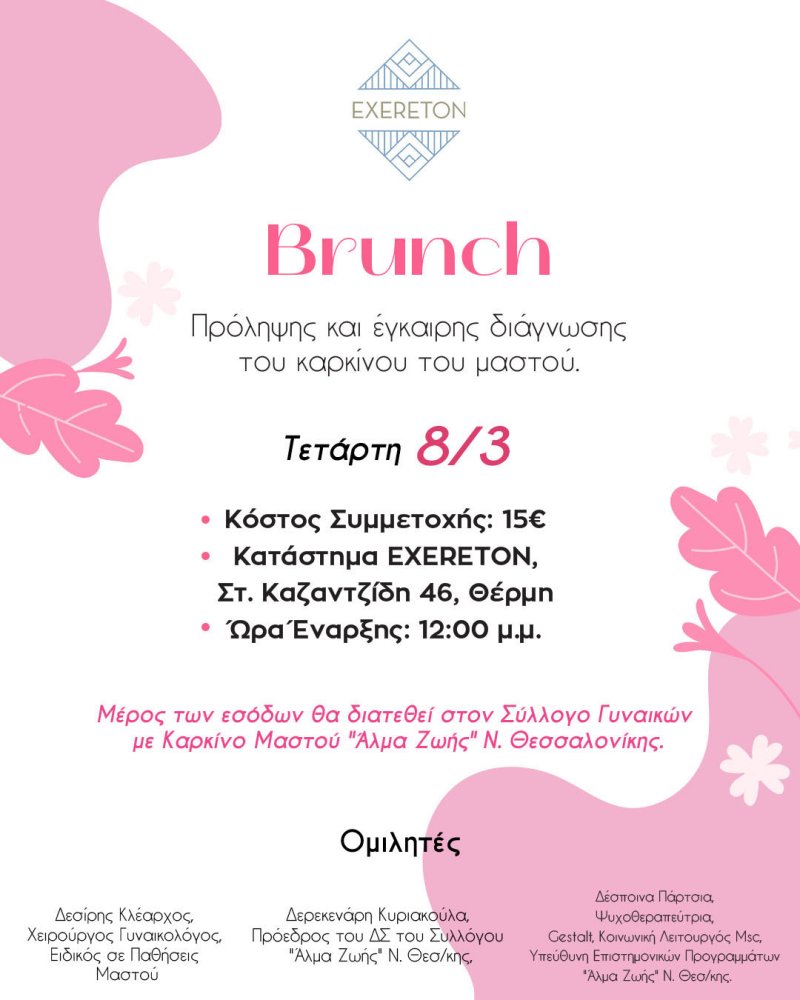 Το Exereton και το Άλμα Ζωής Θεσσαλονίκης, διοργανώνου brunch την Ημέρα της Γυναίκας, με στόχο την πρόληψη και την έγκαιρη διάγνωση του καρκίνου του μαστού. Η εκδήλωση θα πραγματοποιηθεί την Τετάρτη 8 Μαρτίου και θα περιλαμβάνει ειδικούς ομιλητές, νόστιμο φαγητό και καλό σκοπό.