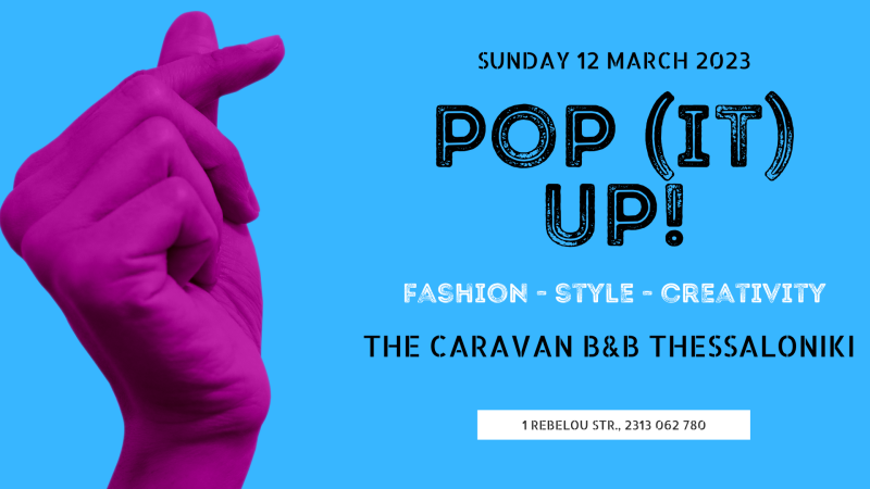Το πρώτο Pop (it) up! event «ξεπετάγεται» στη Θεσσαλονίκη και υποδέχεται την ταλαντούχα δημιουργική κοινότητα της πόλης για μία ημέρα γεμάτη στυλ και έμπνευση. Την Κυριακή 12 Μαρτίου, το The Caravan B&B Thessaloniki μετατρέπει τα δωμάτιά του σε pop up stores για 11 ευρηματικά brands από τις 15:00 έως τις 20:00 και σε προσκαλεί να ζήσεις μία πρωτότυπη fashionable εμπειρία. Παράλληλα, από νωρίς το πρωί έως αργά το βράδυ, οι χώροι του πιο vintage ξενώνα της πόλης θα φιλοξενήσουν workshops, brunch με live μουσική και ένα ξεχωριστό cocktail event!