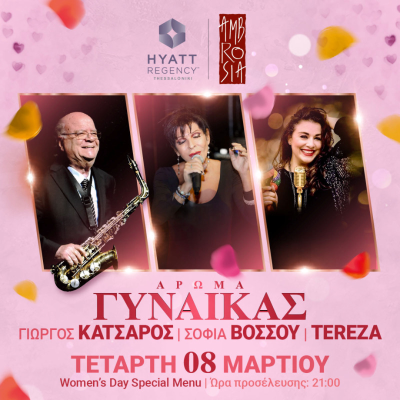 Το Hyatt Regency Thessaloniki γιορτάζει την Ημέρα της Γυναίκας, με μια αξέχαστη βραδιά, παρέα με τις υπέροχες μελωδίες του μοναδικού συνθέτη Γιώργου Κατσαρού, το μουσικό ταλέντο της Σοφία Βόσσου και τη γοητευτική φωνή της Ελληνοαμερικανίδας performer Tereza. Όλα αυτά έρχεται να ολοκληρώσει το εξαιρετικό μενού του executive chef του ξενοδοχείου, Απόστολου Αλτάνη.