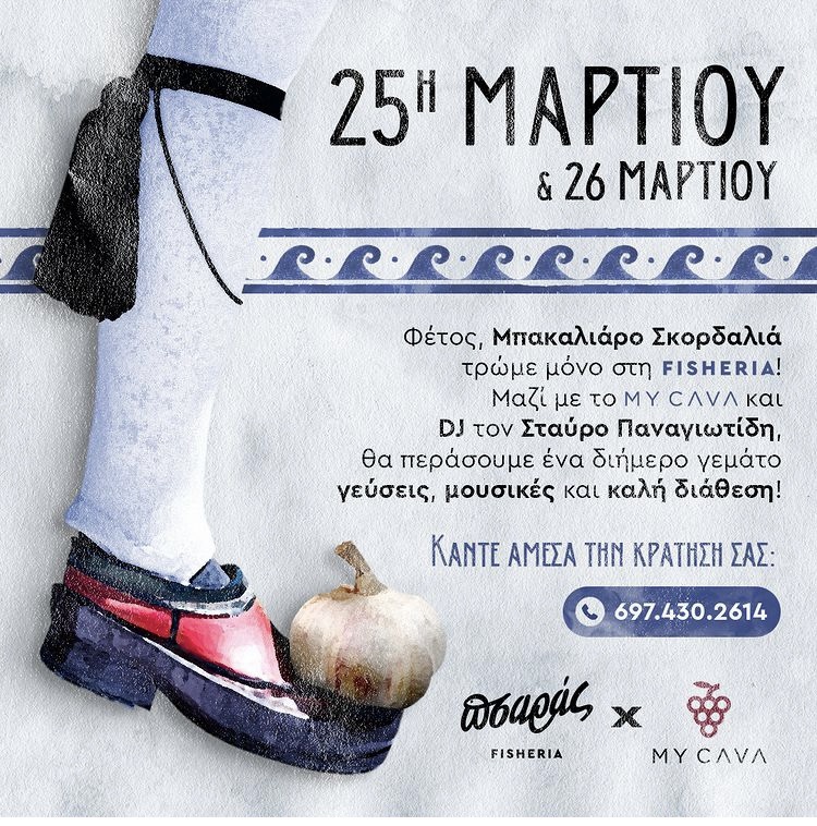 Το όστρακα bar για τους connaisseurs αποθεώνει την τελετουργία της απόλαυσης. Ειδικά για την 25η Μαρτίου, θα σερβίρεται μενού οκτώ πιάτων με μια μερίδα μπακαλιάρου ανά τέσσερα άτομα, το βανάκι από το My Cava θα σας σερβίρει το αγαπημένο σας ποτό, ενώ ο dj Σταύρος Παναγιωτίδης θα δώσει τον ρυθμό σ’ ένα πάρτι πρωτόγνωρο για την περιοχή.