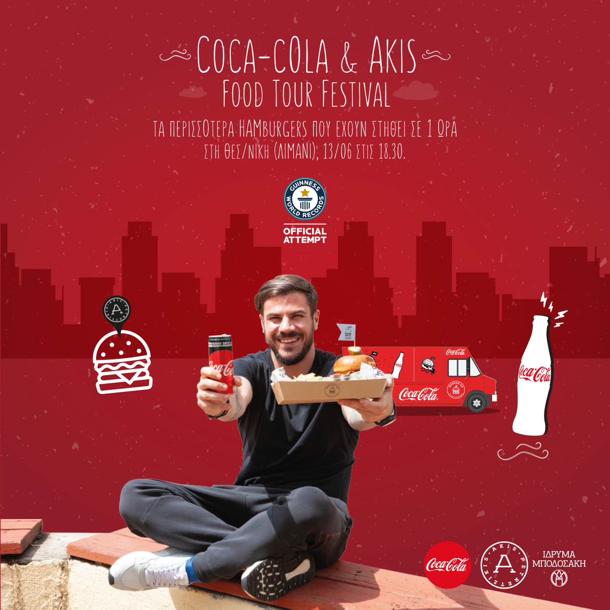 Εκεί, μας περιμένει όλους μία συναρπαστική πρόκληση: ο Άκης Πετρετζίκης με την ομάδα του και την υποστήριξη της Coca-Cola θα επιχειρήσουν να σπάσουν ένα από τα GUINNESS WORLD RECORDS™ για τα περισσότερα hamburgers που έχουν στηθεί ποτέ κατά τη διάρκεια μίας ώρας! Και για να το γιορτάσουν, Coca-Cola και Άκης, σε συνεργασία με το Ίδρυμα Μποδοσάκη, θα προσφέρουν 60.000 γεύματα σε συνανθρώπους μας που το έχουν ανάγκη στις πόλεις που έλαβε χώρα το Coca-Cola & Akis Food Tour Festival.