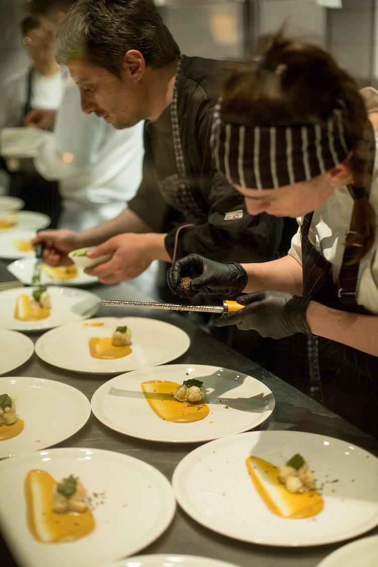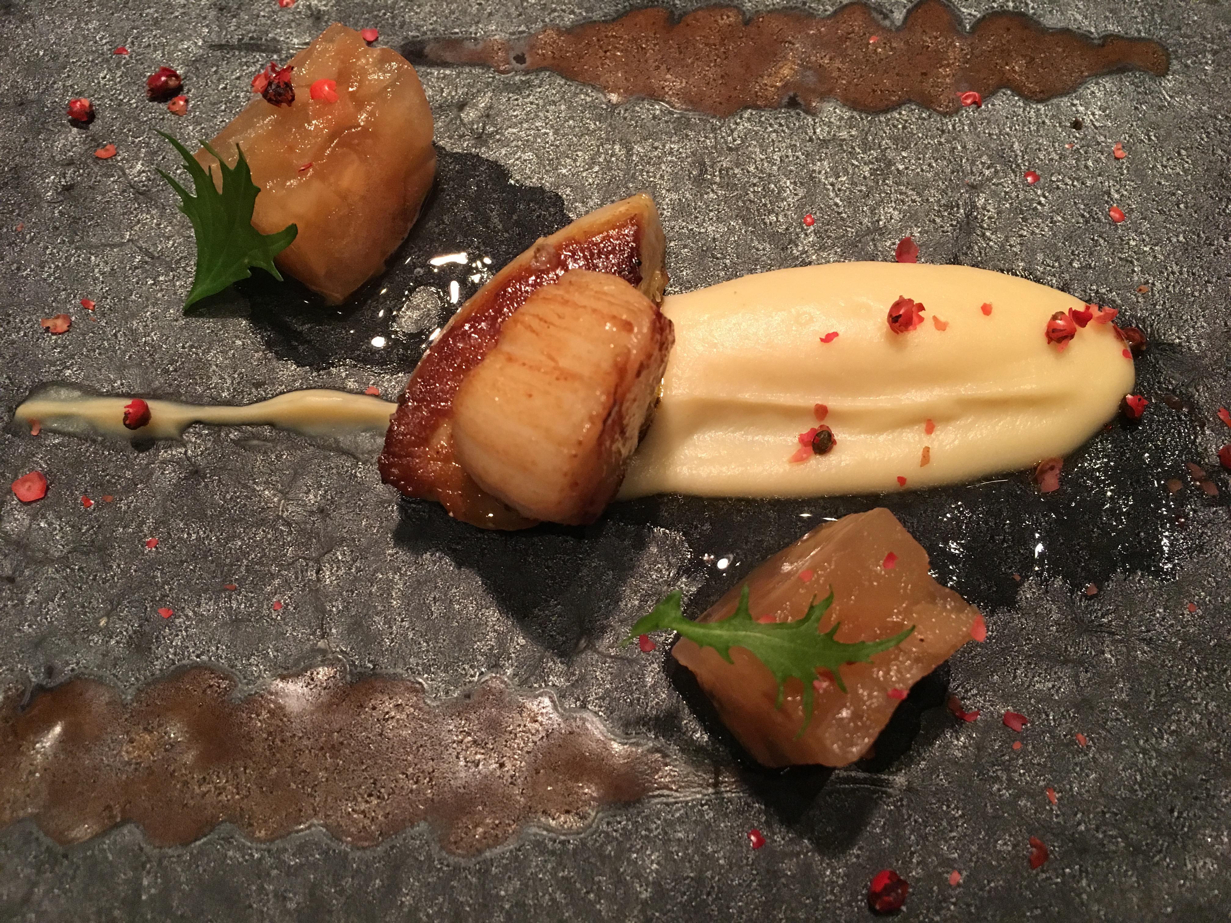 Επειδή η νύχτα είχε οριστεί εξ΄αρχής ως φόρος τιμής στη θάλασσα η στιγμή που μια πεσκανδρίτσα γαρνιρισμένη με μια αναπάντεχη κρέμα παντζάρι, σπανάκι σοτέ και σάλτσα µανταρίνι είναι μια στιγμή που πριν δοκιμάσεις το πάντρεμα οφείλεις να αποτυπώσεις στο νου το πιάτο, μικρό έργο τέχνης, συμφωνία χρωμάτων.