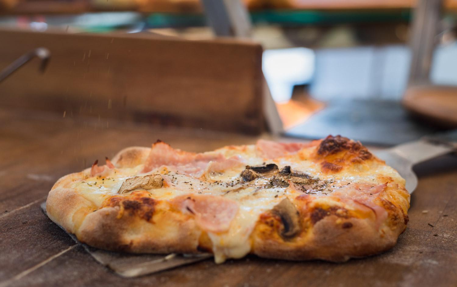 PROSCIUTTO COTTO με φρέσκια μοτσαρέλα, μανιτάρια σαμπινιόν, παρμεζάνα, μείγμα τυριών, σάλτσα ντομάτας, βασιλικός, πιπέρι.