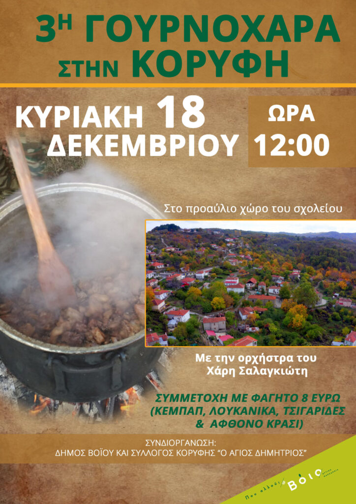 Ο Δήμος Βοϊου και ο Σύλλογος Κορυφής «Άγιος Δημήτριος» μας προσκαλούν (και) φέτος στην 3η Γουροναχαρά που συνδιοργανώνουν την Κυριακή 18/12 και ώρα 12:00