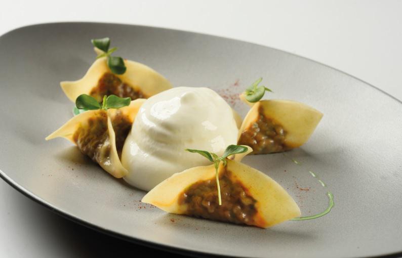Amuse bouche Ελιές και ελαιόλαδο Χαλκιδικής / πελτές από τοματάκια Σερρών / γιαούρτι Δορκάδος. Πρώτο πιάτο Dim sum “Μαντί ” Τραγανά dumplings με βουβαλίσιο κιμά και αφράτο γιαούρτι με καπνιστή πάπρικα.