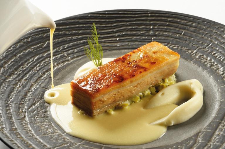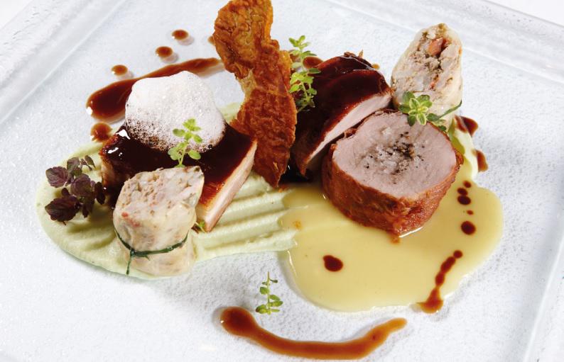 Κυρίως πιάτο Χοιρινό πρασοσέλινο: Αργοψημένη πανσέτα σε φύλλα λεμονιάς, πουρές σελινόριζας με πικραμύγδαλο.