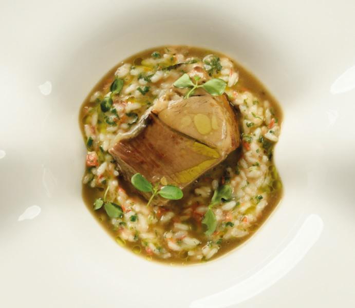 Κυρίως πιάτο Κατσικάκι μαγειρεμένο στη γάστρα με αμπελοβλάσταρα, ριζότο «ψήμα» και σάλτσα από το ζωμό του με φρέσκο δυόσμο (Δημήτρης Παμπόρης).