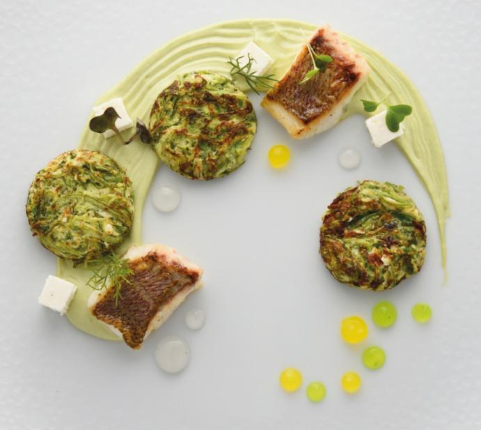 Κυρίως πιάτο Κολοκυθοκεφτέδες με ταραμά αρωματικών και φαγκρί.