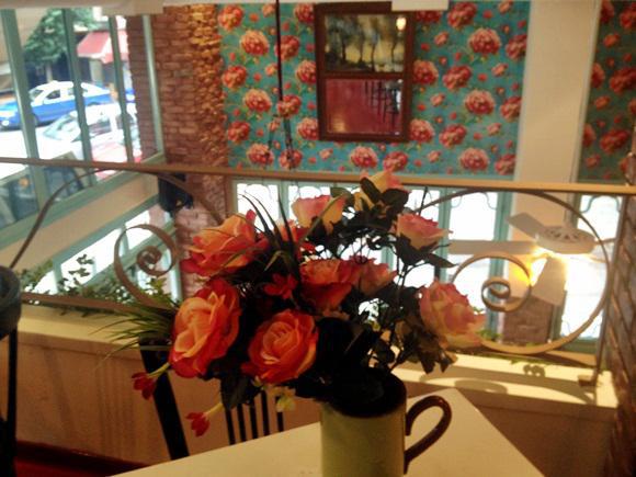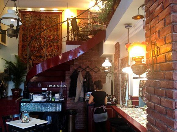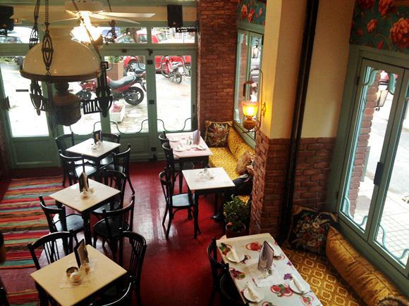 Η είσοδος εντός του σε ξαφνιάζει. Τα υφαντά στον τοίχο, μπάντες τα λέγανε παλιά, χρυσές κορνίζες με φωτογραφίες άλλων εποχών, τριαντάφυλλα στα βάζα, και μαξιλάρες με μπροκάρ υφάσματα.