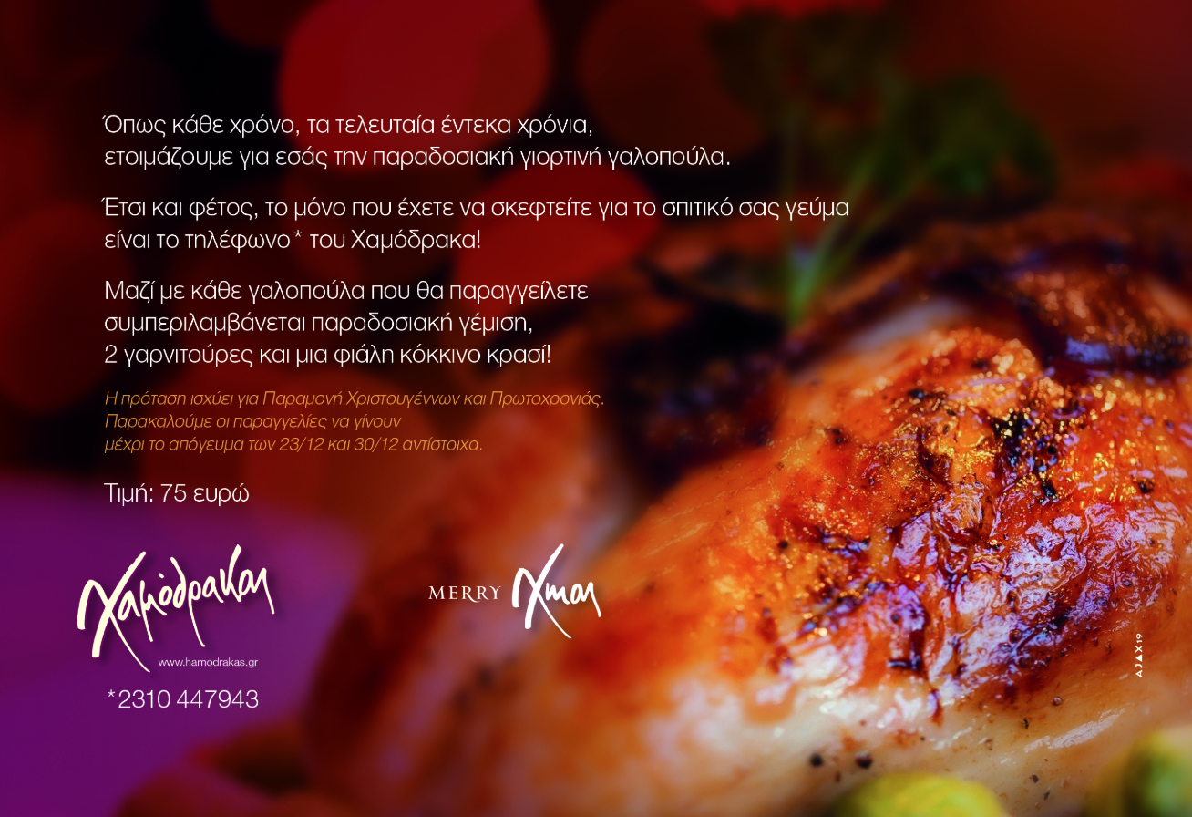 Για ενδέκατη χρονιά, το ιστορικό εστιατόριο της πόλης, ο αγαπημένος μας Χαμόδρακας, προσφέρει την αγαπημένη γαλοπούλα στο σπίτι σας, με υπέροχη γέμιση, γαρνιτούρα και μια φιάλη κρασί στην τιμή των 75 ευρώ. Η παραγγελία αφορά παραμονή Χριστουγέννων και Πρωτοχρονιάς και πρέπει να γίνει μέχρι τις 23/12 και 30/12 αντίστοιχα στο 2310447943.