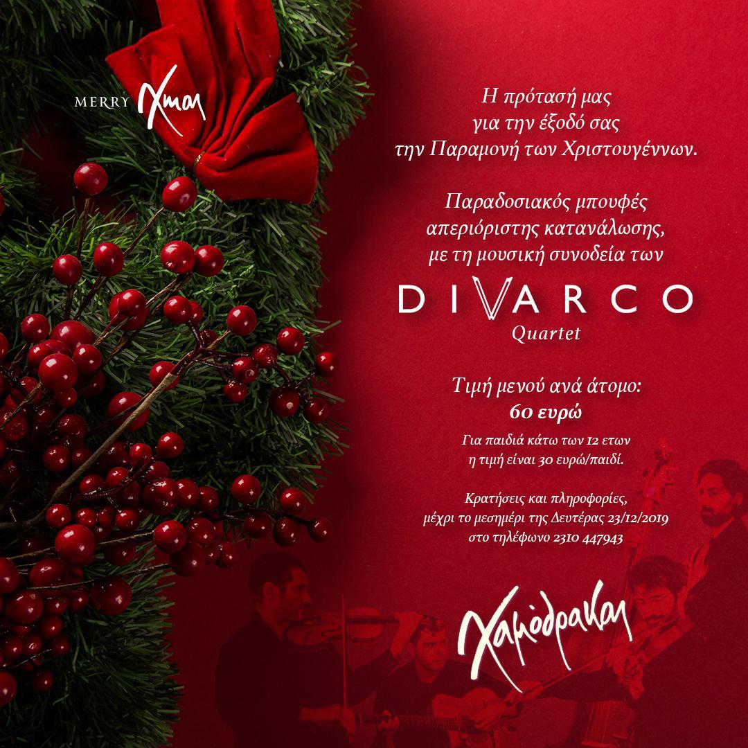 Αν πάλι έχετε τη διάθεση να βγείτε, θα βρεθείτε σε μια υπέροχα στολισμένη αίθουσα μαζί με αυτούς που αγαπάτε, θα περάσετε μια αλησμόνητη παραμονή Χριστουγέννων πλάι στη θάλασσα και τον ορίζοντα της πόλης, παρέα με τη μουσική συντροφιά των DIVARCO, ενός εξαιρετικού κουαρτέτου που θα συνοδεύσει τη βραδιά, με έναν λαχταριστό Χριστουγεννιάτικο μπουφέ, με τη φροντίδα ενός από τα πιο ιστορικά εστιατόρια της πόλης.