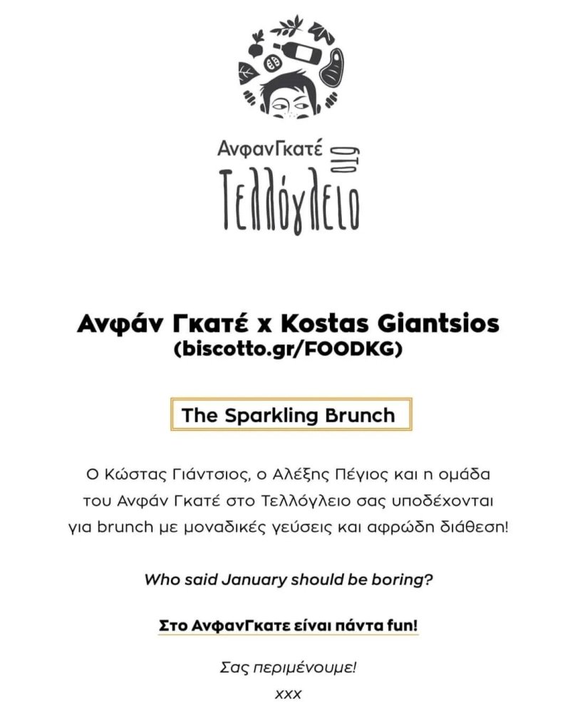 Ο Κώστας Γιάντσιος, ο Αλέξανδρος Πέγιος & η ομάδα του ΑνφάνΓκατέ σας υποδέχονται για brunch με μοναδικές γεύσεις και αφρώδη διάθεση αυτό το σαββατοκύριακο .