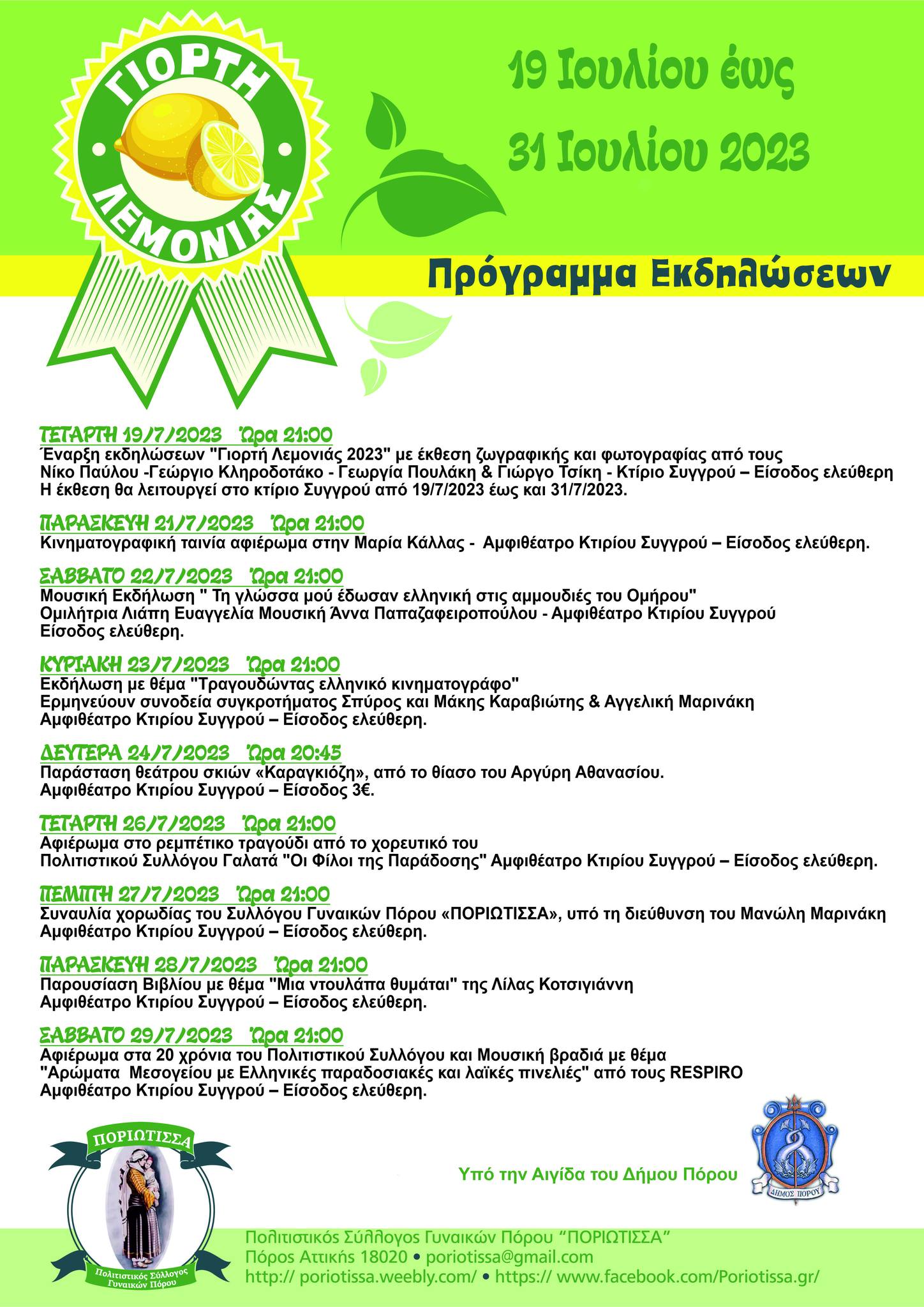 Επιστρέφει για ακόμη μια χρονιά το Πολιτιστικό φεστιβάλ “Γιορτή Λεμονιάς” που διοργανώνει ο Πολιτιστικός Σύλλογος Γυναικών Πόρου “Η Ποριώτισσα”, τις τελευταίες ημέρες του Ιουλίου.