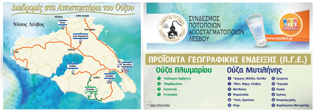 Κάθε χρόνο, από το 2013, ο Σύνδεσμος Ποτοποιών – Αποσταγματοποιών Λέσβου διοργανώνει το Ouzo Fest, ένα μοναδικό φεστιβάλ γνωριμίας με το ούζο, την κουλτούρα του και τα μυστικά του. Ο επισκέπτης έχει τη δυνατότητα να δοκιμάσει περισσότερες από 40 ετικέτες ούζου, να συνομιλήσει με τους ποτοποιούς, να μυηθεί στα μυστικά του ούζου, να δοκιμάσει τη γαστρονομία της Λέσβου και να απολαύσει το ούζο του στα γραφικά καφενεδάκια της Μυτιλήνης και του Πλωμαρίου.