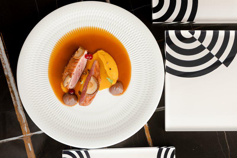 Στη στεριά η πάπια Rougie με κλημεντίνες, χουρμάδες και μανιτάρια γλυκόξινα είναι ένα παιχνίδι Ανατολής Δύσης.