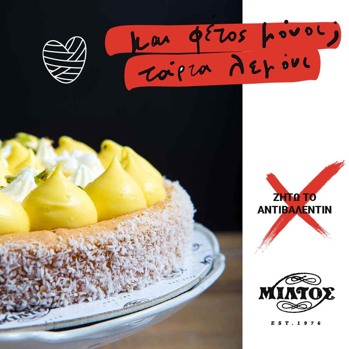Όπως και να αισθάνεσαι τη φετινή μέρα του έρωτα, Βαλεντίνος ή Αντι-Βαλεντίνος, κάνε μια πράξη που θα την ομορφύνει και θα αλλάξει τη διάθεση σου. Με μια βόλτα σε ένα από τα ζαχαροπλαστεία Μίλτος ή απλά με ένα κλικ στο miltos.gr/valentine για τους ερωτευμένους και για τους αντι-βαλεντίνους και τις μοναχικές καρδιές εδώ miltos.gr/antivalentine
