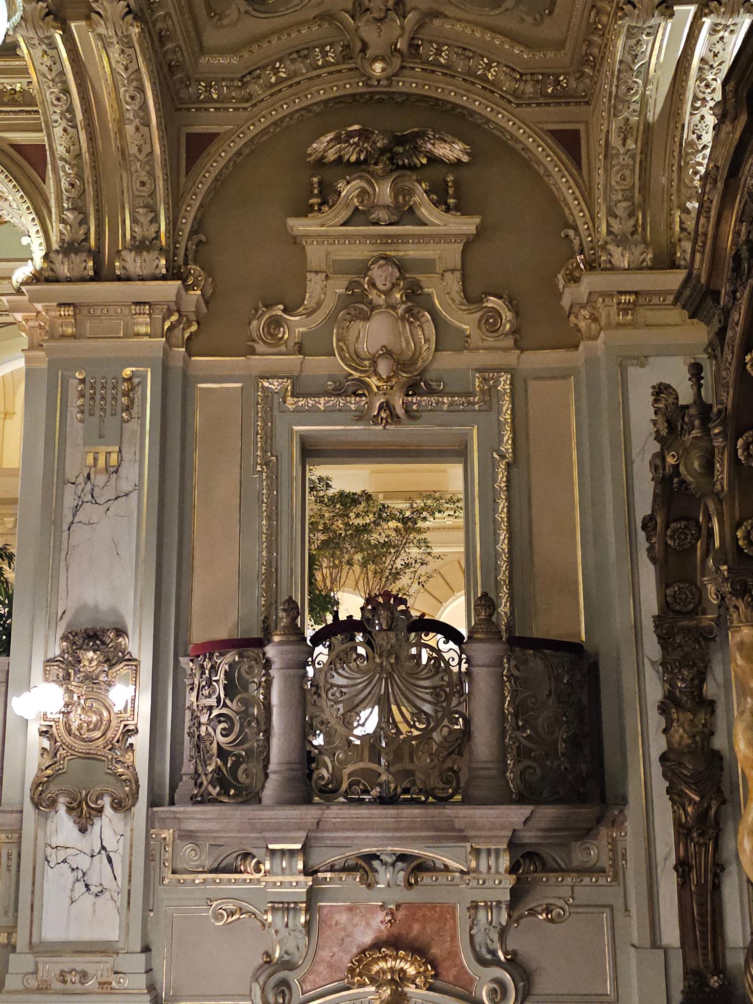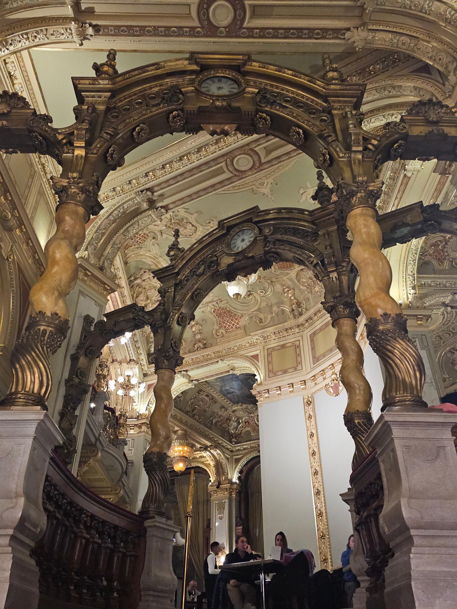Το εσωτερικό του καφέ με τις στριφτές κολώνες του, θυμίζει εν μέρει το σχέδιο των μπαρόκ εσωτερικών χώρων εκκλησιών. Εκτός από το μάρμαρο, τα γύψινα, το βελούδο και το μετάξι, σημαντικό ρόλο στους χώρους υποδοχής του καφέ έχει και η χρήση του μπρούτζου.