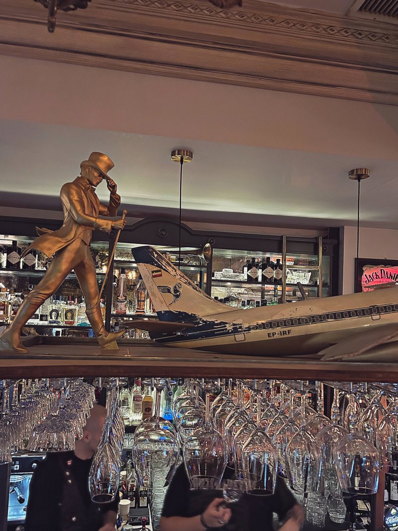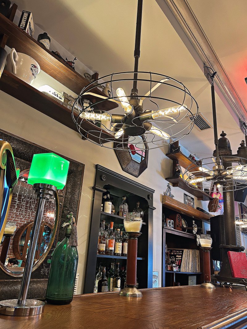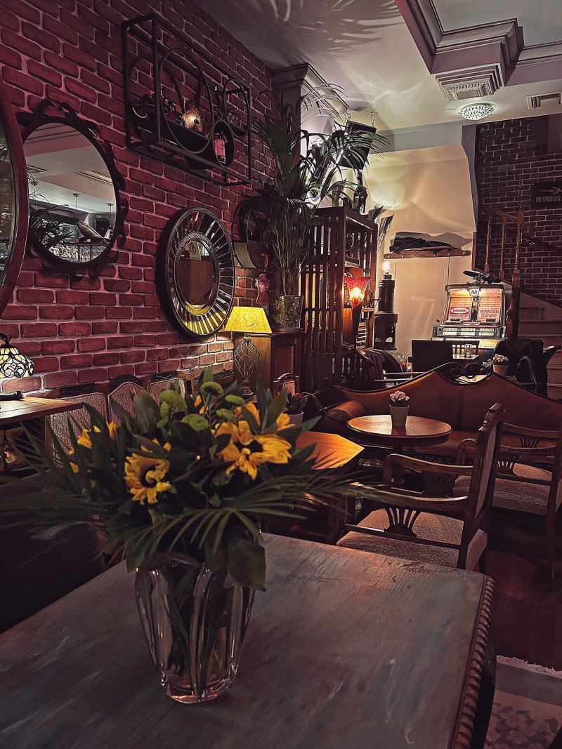 Το σκηνικό μαγικό: το διώροφο ψηλοτάβανο μαγαζί με το εσωτερικό μπαλκόνι, τις τοιχογραφίες του ‘50 στα ταβάνια και κάποια γύψινα που έμειναν ανέγγιχτα -ως κομμάτι του αρχικού κτιρίου- φιλοξενεί μέρος της τεράστιας συλλογής vintage αντικειμένων και αντικών του κ. Καπελιώτη-τα οποία μπορείς να αγοράσεις κιόλας!-, συνθέτοντας ένα ιδιαίτερα high aesthetic και cosy περιβάλλον. Με έναν παράδοξο τρόπο όλα τα κομμάτια -αν και ανόμοια μεταξύ τους- δένουν αρμονικά ολοκληρώνοντας ένα interior τύπου Ν. Ορλεάνης, στο οποίο πρωταγωνιστεί η μεγάλη μπάρα με τα σκαμπό -το κέντρο της δράσης του μαγαζιού- μαζί με το one of a kind juke box, τους εντυπωσιακούς καθρέφτες και τη στρογγυλή βιτρίνα με τα υπέροχα τιρκουάζ αντικείμενα. Στον πάνω όροφο, η ίδια αισθητική ολοκληρώνεται με συλλεκτικά κομμάτια και προσωπικές φωτογραφίες των ιδιοκτητών και διάσημων φίλων του μαγαζιού, καθώς και μια 75’’ οθόνη, για όσους θέλουν να παρακολουθήσουν το αγαπημένο τους θέαμα. Επιπλέον, ως αυτόνομος χώρος αποτελεί την ιδανική επιλογή για ιδιωτικά πάρτι, επαγγελματικές συναντήσεις και κάθε είδους κοινωνικά events, που επιθυμείς να έχουν τη σφραγίδα μιας ιδιαίτερης αισθητικής.