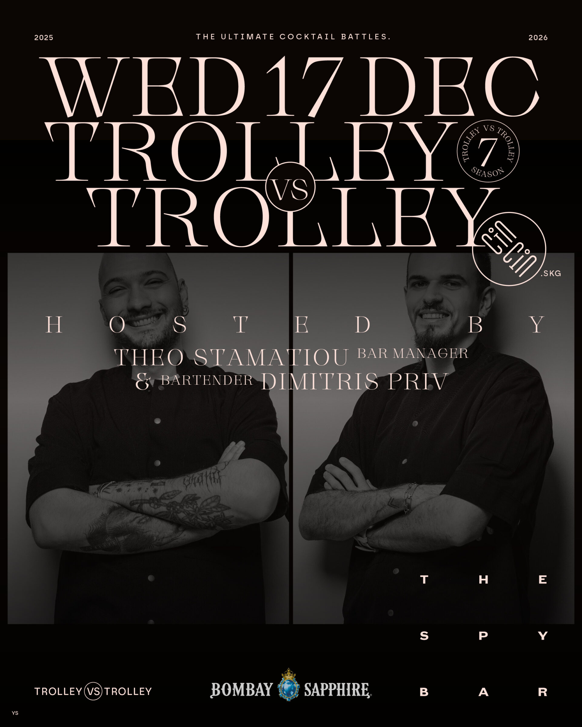 Κρυμμένο κάτω από το Old War Office — την ιστορική έδρα της MI6 — το Spy Bar δεν σερβίρει απλώς cocktails, δημιουργεί εμπειρίες με πλοκή, ακρίβεια και ένταση. Οι Sotiris Konomi και Lee του The Spy Bar έρχονται αντιμέτωποι με τους Θοδωρής Σταματίου και Δημήτρης Πριβαρτιτσιάνης του Cin Cin Thessaloniki σε μια μάχη όπου κανείς δεν παίζει συντηρητικά. Όταν το επίπεδο ανεβαίνει, οι bartenders καλούνται να βγάλουν τους άσους από το μανίκι τους — και το κοινό γίνεται μάρτυρας σπάνιων δημιουργιών που σου προκαλούν έντονα συναισθήματα.