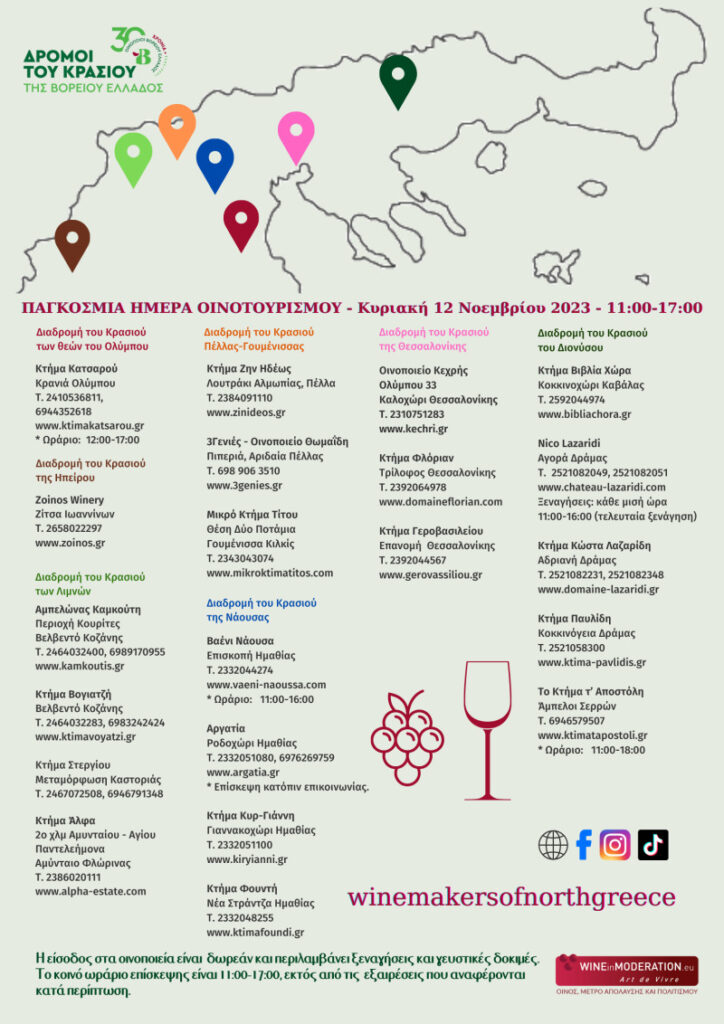 21 επισκέψιμα οινοποιεία, μέλη της ένωσης «Οινοποιοί Βορείου Ελλάδος», συμμετέχουν στον εορτασμό της «Παγκόσμιας Ημέρας Οινοτουρισμού» και προσκαλούν τους φίλους του κρασιού για οινο-ξεναγήσεις και οινο-γευσίες στους χώρους παραγωγής των εξαίρετων οίνων που δημιουργούν.