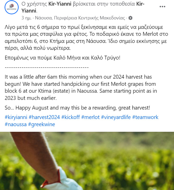 Το κτήμα ΚΥΡ-ΓΙΑΝΝΗ, με ανάρτησή του, αναφέρει πως σήμερα το πρωί άρχισε να μαζεύει τα πρώτα σταφύλια, με το ποδαρικό να κάνει το Merlot στο αμπελοτόπι 6, στη Νάουσα.