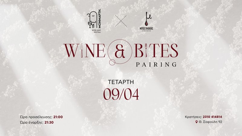 Η Μονμάρτη σε προσκαλεί σε ένα wine & bites pairing σε συνεργασία με το Οινοποιείο Μποσινάκη, το οποίο θα πλαισιώσει ιδιαίτερες γεύσεις σε μία ωραία βραδιά την Τετάρτη 9 Απριλίου. Το οινοποιείο Μποσινάκη βρίσκεται στην καρδιά της Μαντίνειας, σε υψόμετρο 660 μ., στο μικρό χωριό Στενό. Η κύρια ποικιλία σταφυλιών του κτήματος είναι το Μοσχοφίλερο και η οικογένεια Μποσινάκη έχει συμβάλει σημαντικά στην ανάδειξη αυτής της τοπικής ποικιλίας. Αποκλειστικά για αυτές τις 4 ετικέτες, η ομάδα της Μονμάρτης δημιουργεί ένα ειδικά διαμορφωμένο μενού γεμάτο εκπλήξεις και ευχάριστες αντιθέσεις!