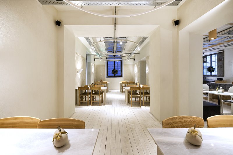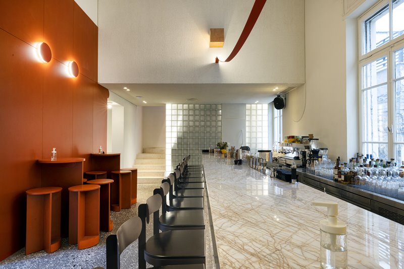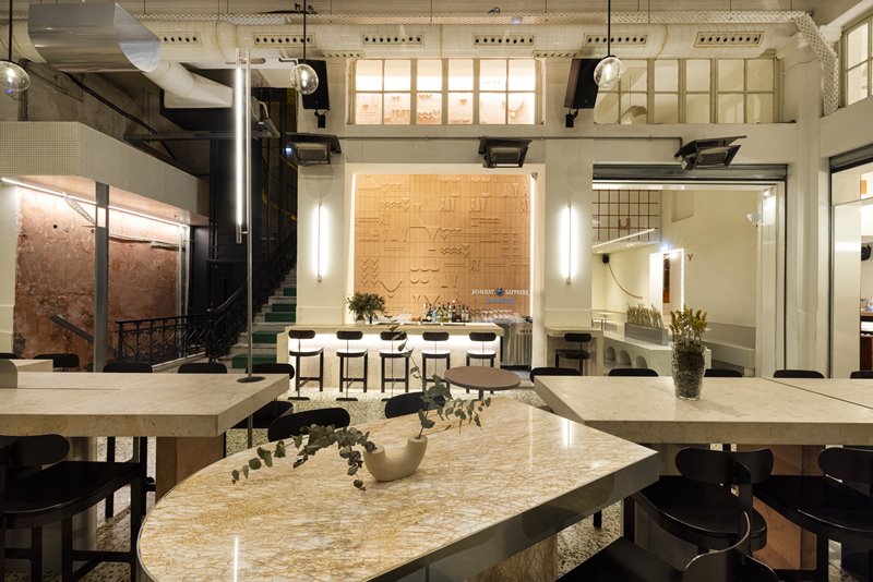Έτσι, η επανάχρηση του κτιρίου μετατρέπεται σε μια σχεδόν πνευματική διαδικασία -μέρος της οποίας αποτελεί και η διατήρηση του ονόματος του πρώτου ιδιοκτήτη του κτιρίου-, πολύ περισσότερο όταν αρχίζεις να κατεβαίνεις τα σκαλιά για να βρεθείς από τον χώρο του μπαρ στο πρώτο επίπεδο, στο εστιατόριο. Η αίσθηση πρωτόγνωρη. Σαν να μπαίνεις σε μια «φούσκα ασφάλειας» -μετά από έναν χώρο ζωντανό με κόσμο, που χορεύει, διασκεδάζει, φωνάζει-, για μια μυσταγωγία που ετοιμάζεται να συμβεί.