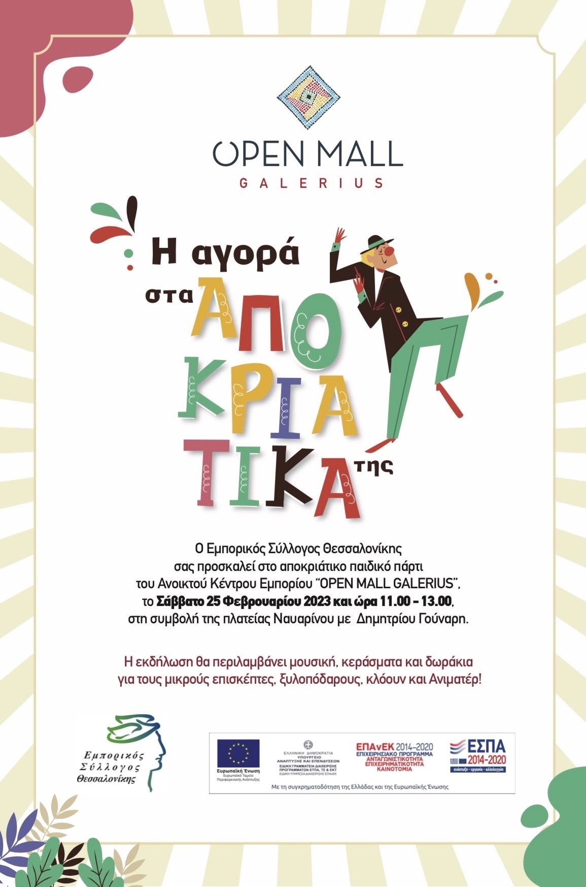 Ατμόσφαιρα καρναβαλιού στο κέντρο της πόλης και της αγοράς δημιουργεί ο Εμπορικός Σύλλογος Θεσσαλονίκης με τη νέα, επίκαιρη δράση που διοργανώνει στο πλαίσιο εφαρμογής του Έργου «Ανοικτά Κέντρα Εμπορίου – Δ. ΓΟΥΑΝΑΡΗ» – «OPEN MALL GALERIUS».