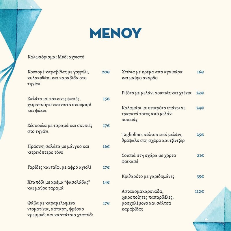 Η Estrella θα έχει ειδικό μενού Καθαράς Δευτέρας όπως και το Αιβαλί και το Ikigai που θα προτείνει ένα πολύ ενδιαφέρον μενού με παραδοσιακές σαρακοστιανές γεύσεις με ευωδιά Ανατολής. Σαρακοστιανά θα κάνουν και Tarantino, Picco, Pasta Fresca και Φαλάφελ Middle East.