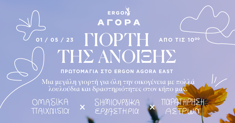 Γιόρτασε την Πρωτομαγιά με ένα απολαυστικό event για παιδιά όλων των ηλικιών στον κατάφυτο κήπο του Ergon Agora East για μια μέρα γεμάτη δραστηριότητες και παιχνίδι. Τι σηματοδοτεί επίσημα την άνοιξη; Τα λουλούδια! Από τη γιορτή δεν θα λείπουν τα άνθη και τα φυτά τα οποία θα γεμίσουν το χώρο με αρώματα και θα δημιουργήσουν μια καταπληκτική ατμόσφαιρα για να περάσεις εκεί ατέλειωτες ώρες.