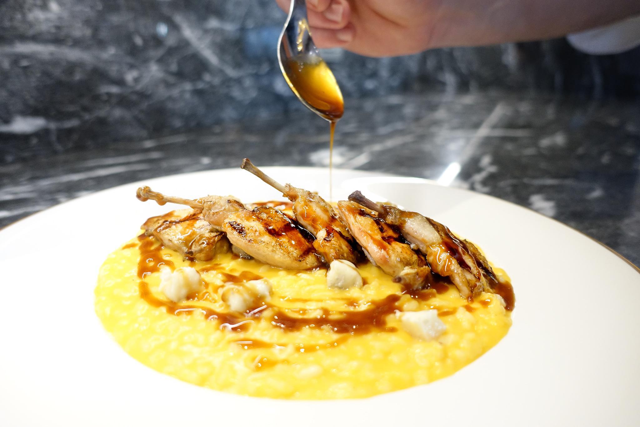 Σπουδαία ορτύκια φλαμπέ με Αρμανιάκ, παλαιωμένο ριζότο Acquerello με κολοκύθα και γκοργκοντζόλα.