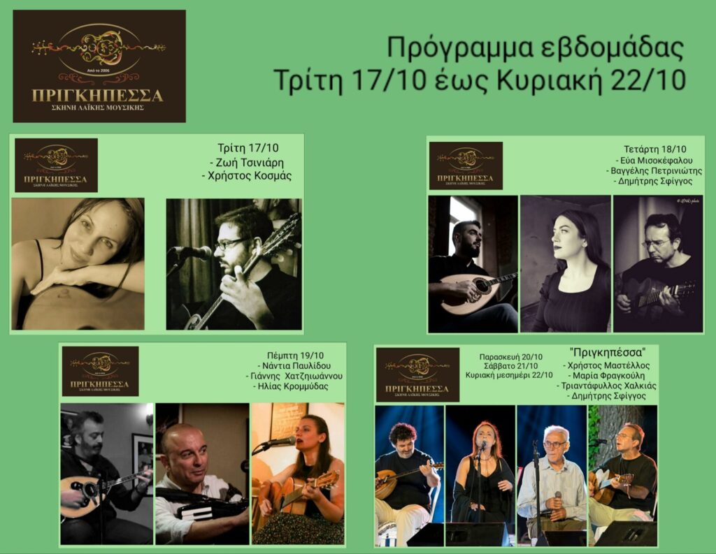 Η “Πριγκηπέσσα” , το απόλυτο καλλιτεχνικό στην περιοχή του Λευκού Πύργου, σε περιμένει κάθε βράδυ μετά τις 8μμ, με διαφορετικά σχήματα της πόλης, αποτελούμενα από παλιούς και νέους μουσικούς, με αγαπημένα λαϊκά, ρεμπέτικα και έντεχνα τραγούδια. Τη μουσική ολοκληρώνουν τα προσεγμένα γευστικά πιάτα του, φτιαγμένα με μεράκι από τα χέρια του μάγειρα. Το πρόγραμμα ανακοινώνεται κάθε εβδομάδα στα social media του μαγαζιού, καθώς και στους περισσότερους οδηγούς πόλης.