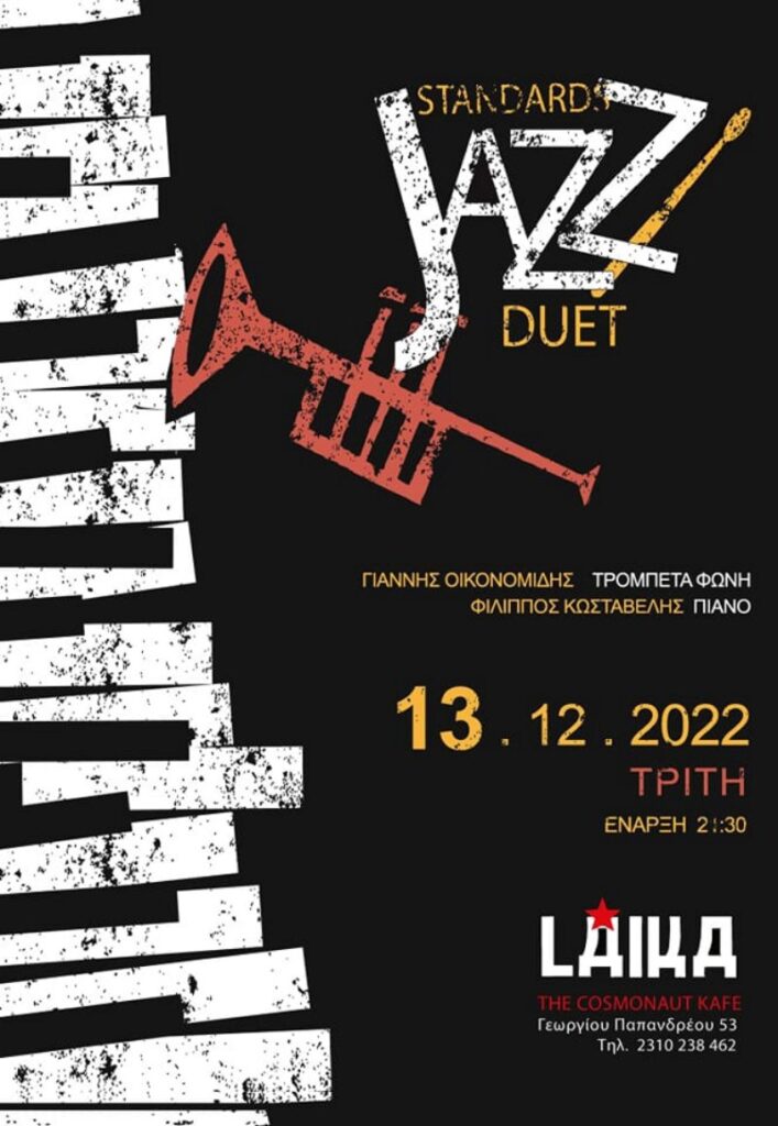 Μετα απο τρια χρονια αποχης, λογω των γνωστων συνθηκων, η Laika παρουσιάζει απόψε το βράδυ, τον Γιαννη Οικονομιδη στην τρομπετα και φωνή και τον Φιλιππο Κωσταβελη στο πιανο, σε ενα pre christmas live με jazz standards και οχι μονο! Don’t Miss!
