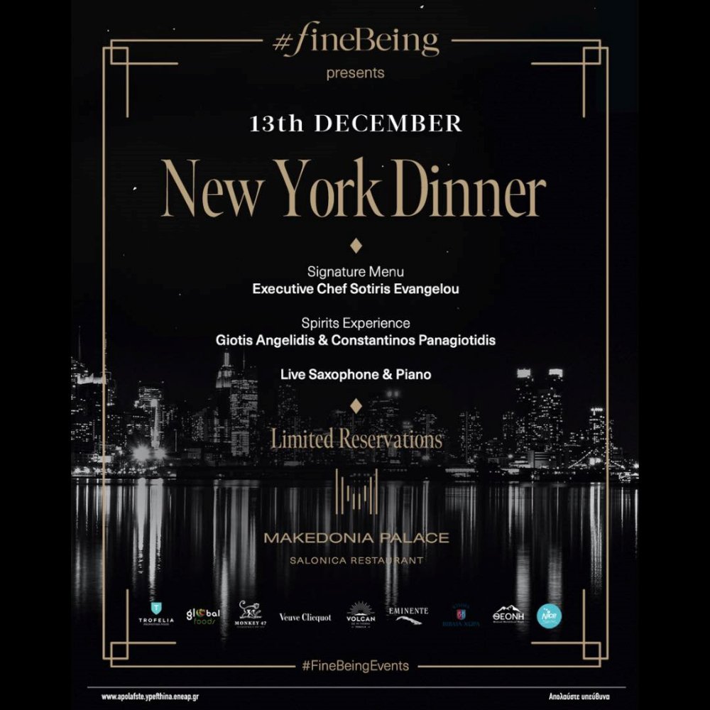 Το FineBeing παρουσιάζε απόψε το New York Dinner στο Salonica Restaurant του Makedonia Palace Hotel Thessaloniki. με ένα signature menu 5 πιάτων από το σεφ Σωτήρη Ευαγγέλου εμπνευσμένο από τα εμβληματικά και βραβευμένα εστιατόρια της Νέας Υόρκης. Τη γαστρονομική εμπειρία συμπληρώνουν με Wine & Spirits Pairing ο Γιώτης Αγγελίδης και ο World Class Winner Spain Κωνσταντίνος Παναγιωτίδης, ενώ τη βραδιά θα συνοδεύουν live μουσικές σαξόφωνου και πιάνο.