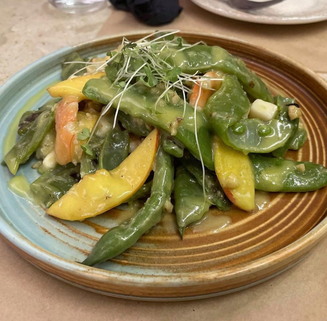 Καλωσορίζοντας το Φθινόπωρο με έναν μεζέ εποχής. Φασολάκια σχάρας με ροδάκινο, καρύδι, τυρομάλαμα, γαρίδες και λαδολέμονο.