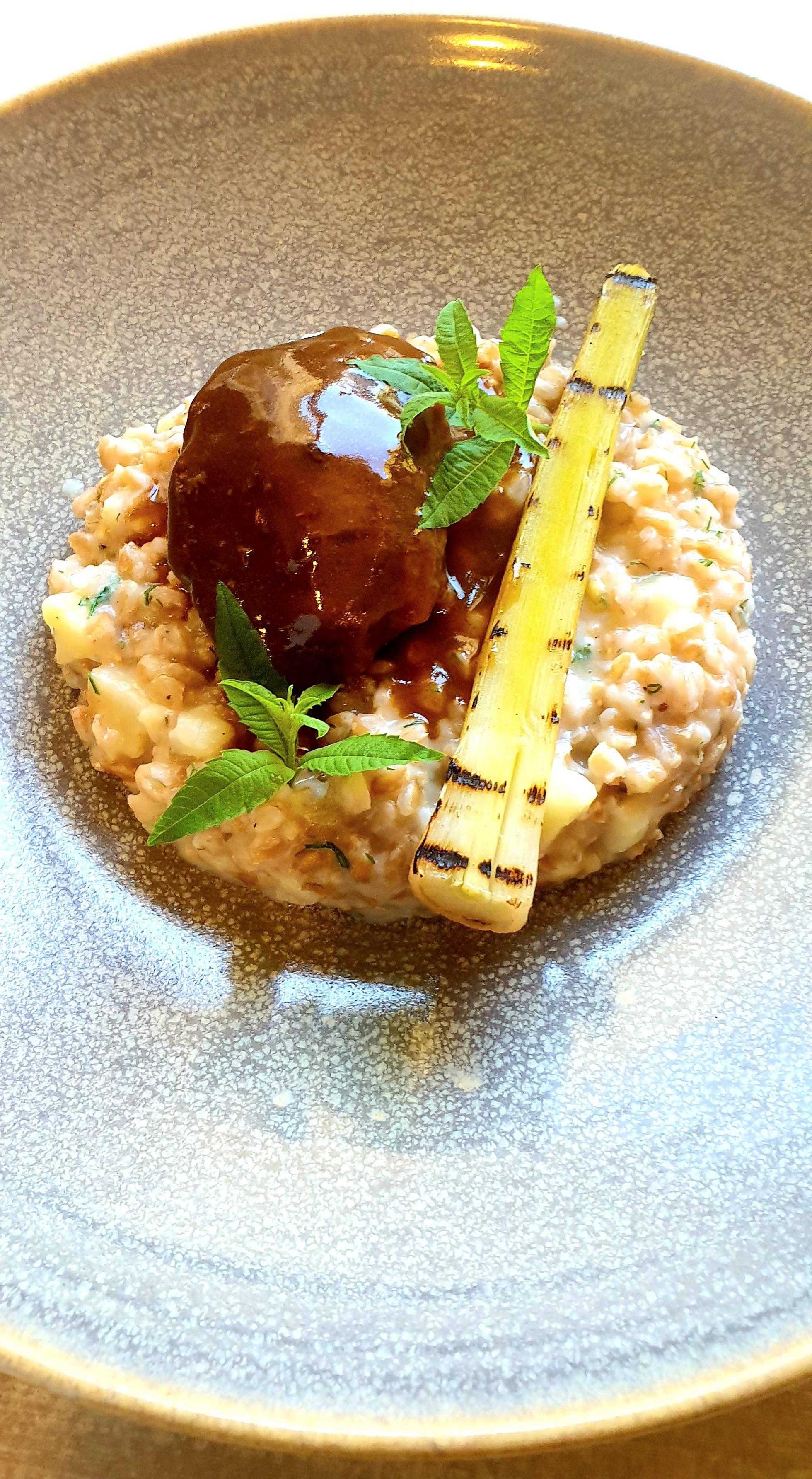 Γευστικά μάγουλα μαύρου χοίρου braise με μαύρη τρούφα, σιτάρι σελινόριζας και ψητό πράσο.