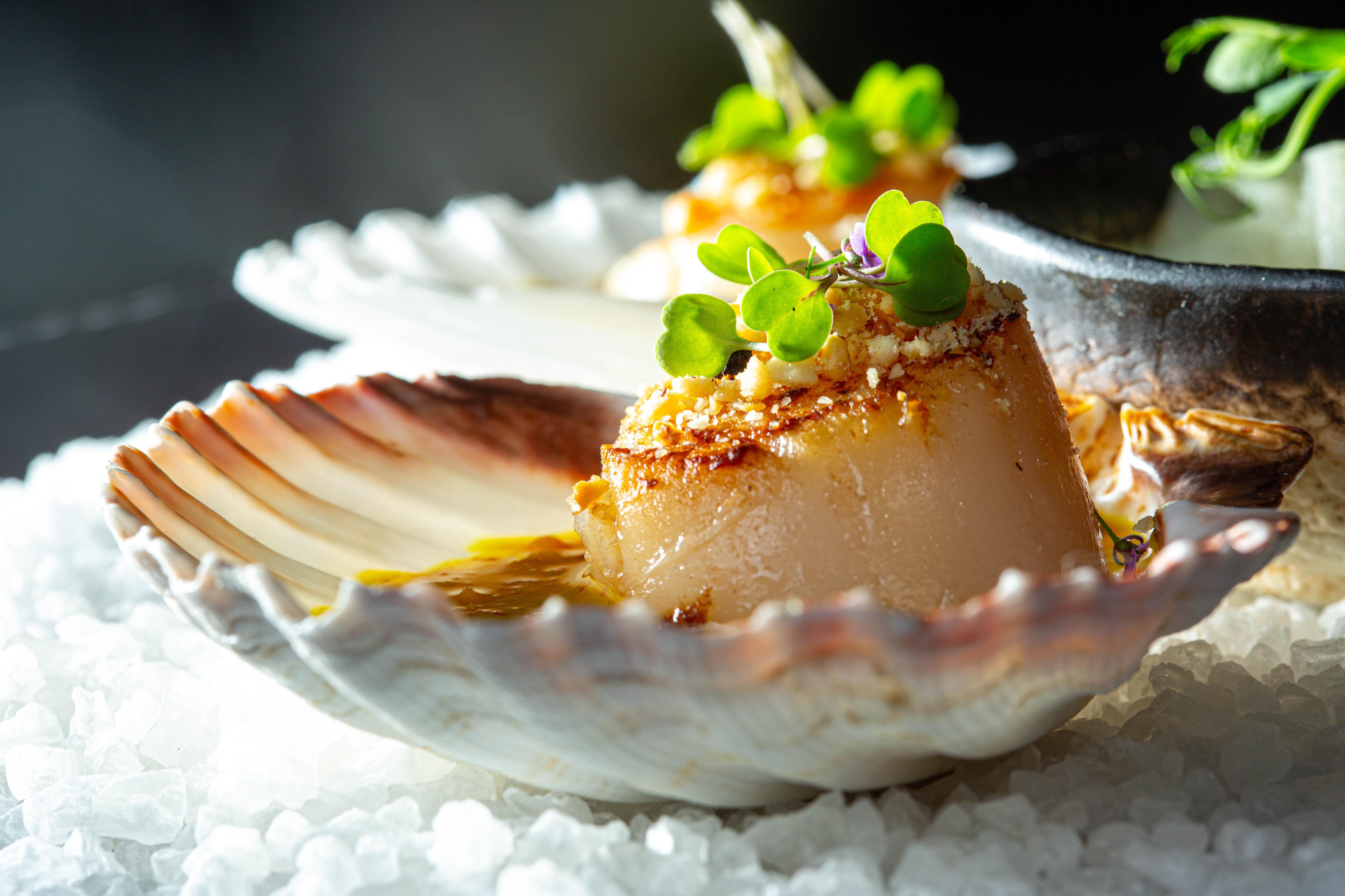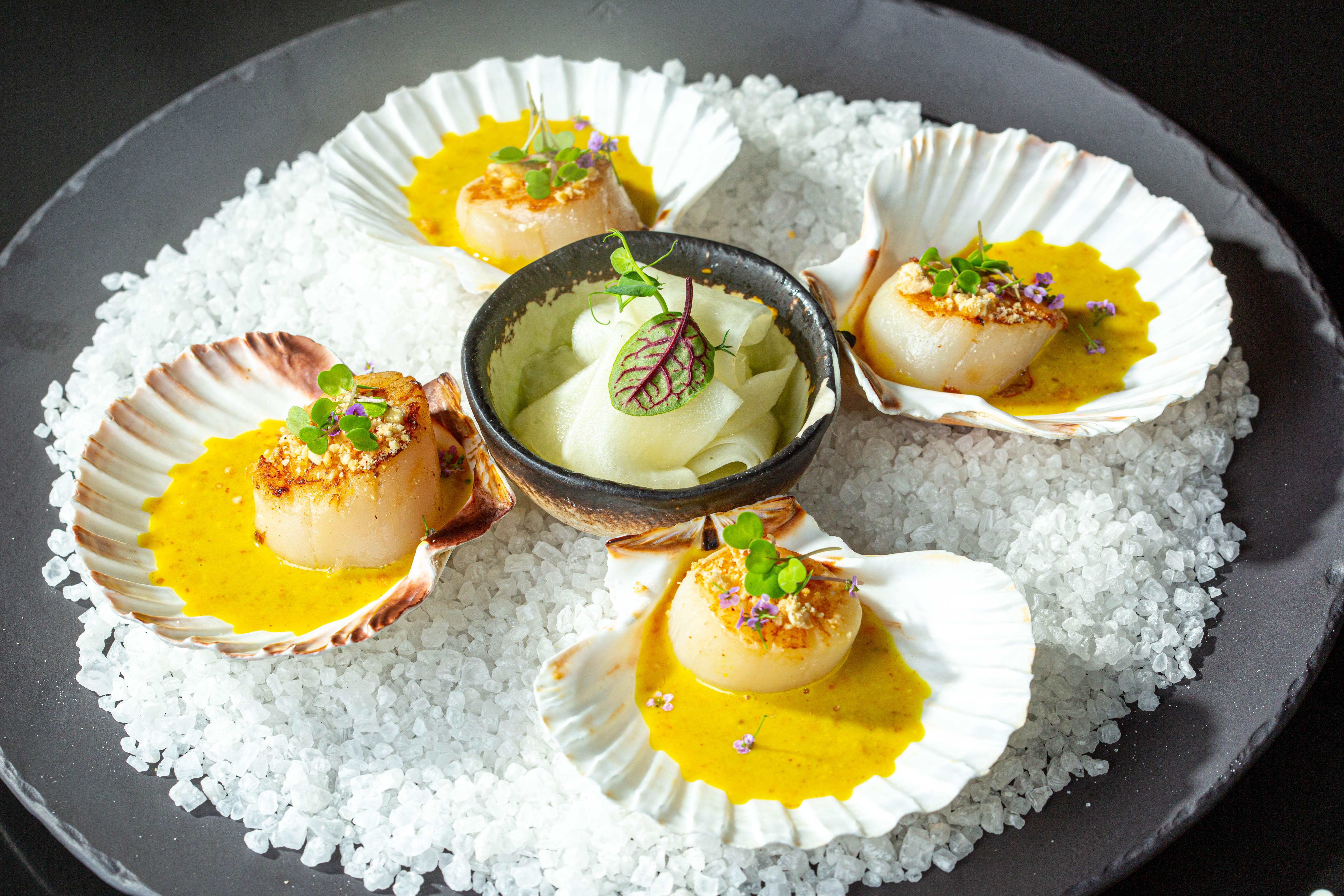 Σαλάτες δροσερές με πάπια, θαλασσινά, μια αναπάντεχη συνάντηση χοιρινού με καβούρι, χτένια κρυμμένα στις παρυφές φυλλωμάτων, θαυμάσια παντρεμένο μεσκλάν με γαρίδες.