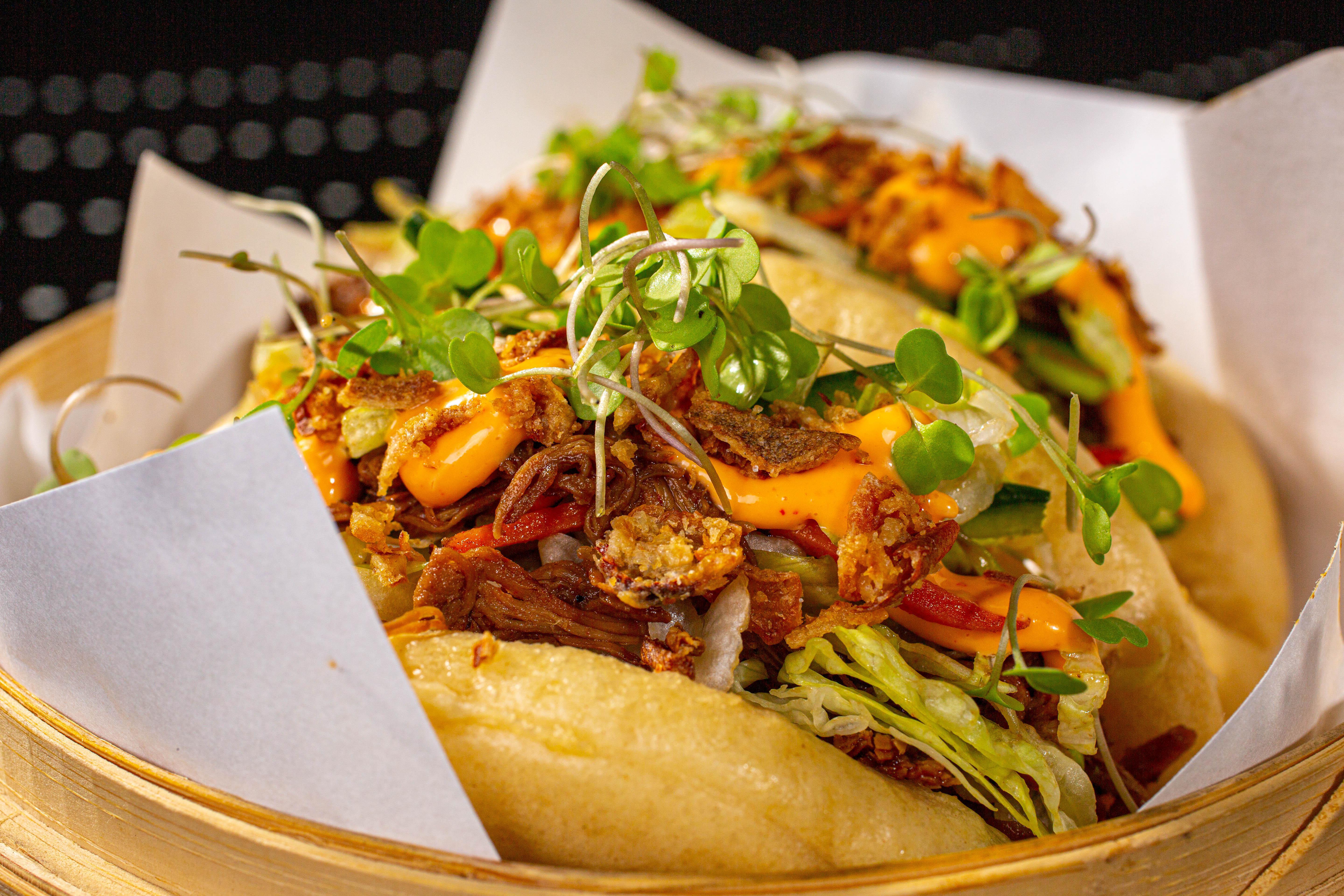 Θεϊκά Bao Ban, Gyoza με γαρίδα, χταπόδι, βασιλικά καβουροπόδαρα, λαυράκι σάλτσα εσπεριδοειδώνκαι ponzu ή μοσχαράκι, foie gras, τρούφα, εσπεριδοειδή και ponzu.