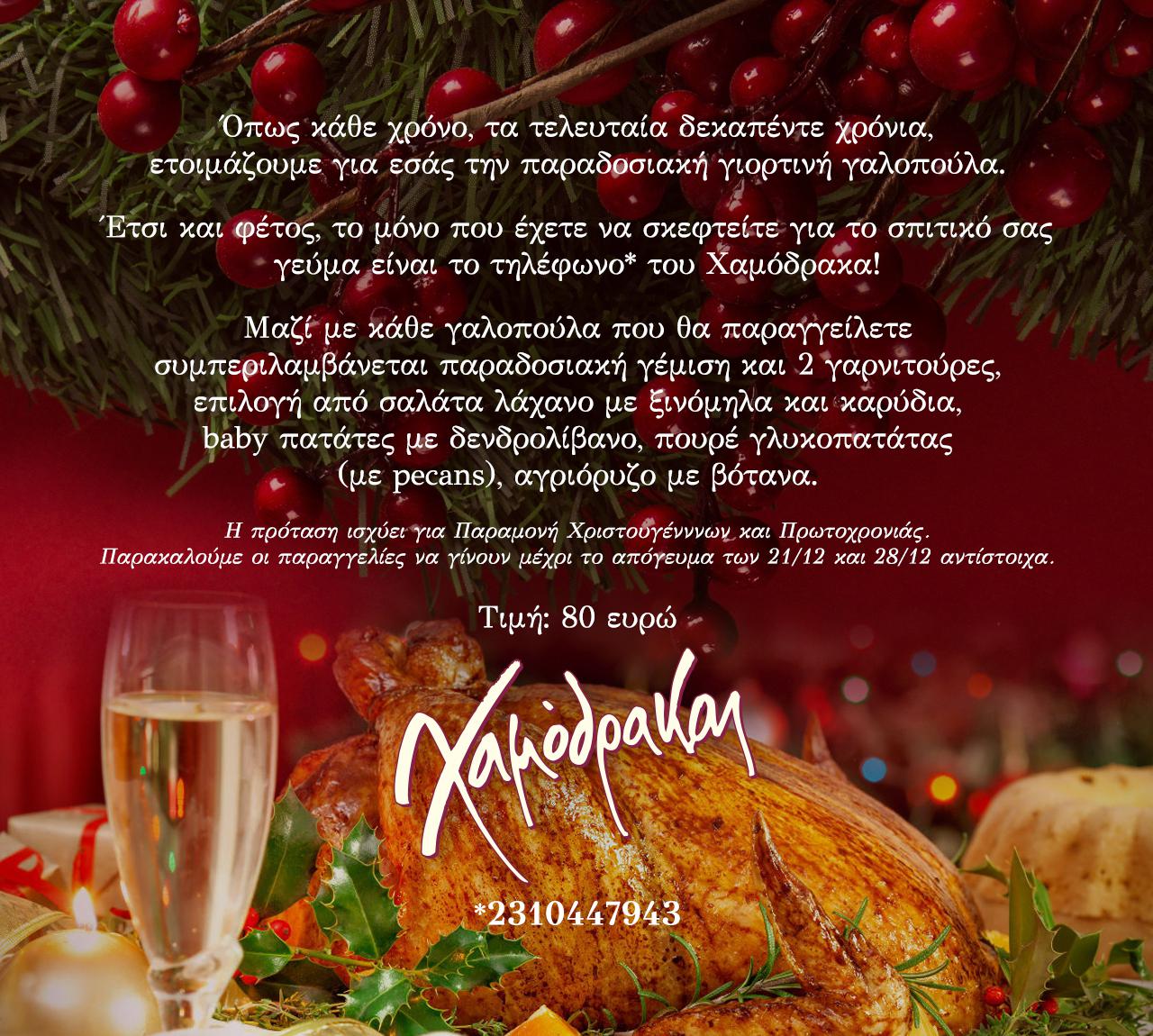 Τα τελευταία 15 χρόνια, ένα από τα καλύτερα εστιατόρια της Θεσσαλονίκης ετοιμάζει μια θεϊκή παραδοσιακή γιορτινή γαλοπούλα. Μια γαλοπούλα με απίστευτη γέμιση που πατά στην παράδοση του πιάτου που αποθεώνουμε όλοι αυτές τις ημέρες και την φέρνει στο σπίτι σας άψογα και σπιτικά προετοιμασμένη με 2 γαρνιτούρες.