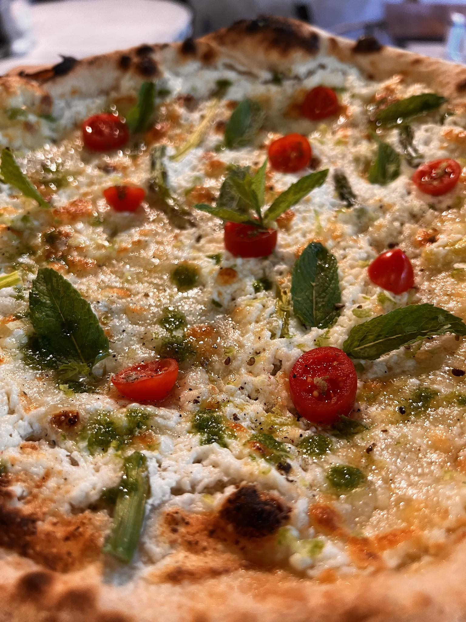 Σε μία χειροποίητη ζυμωτή λεπτή ζύμη η ρικότα ωρίμανσης παντρεύτηκε με την φρέσκια μοτσαρέλα για έναν μαγικό συνδυασμό που θα χαρίσει την απόλυτη απόλαυση στον ουρανίσκο σας, τα σπαράγγια “ξάπλωσαν” επάνω στο απόλυτο μείγμα ιταλικών τυριών και δροσίστηκαν από το ξύσμα lime και των μυρωδάτο δυόσμο.