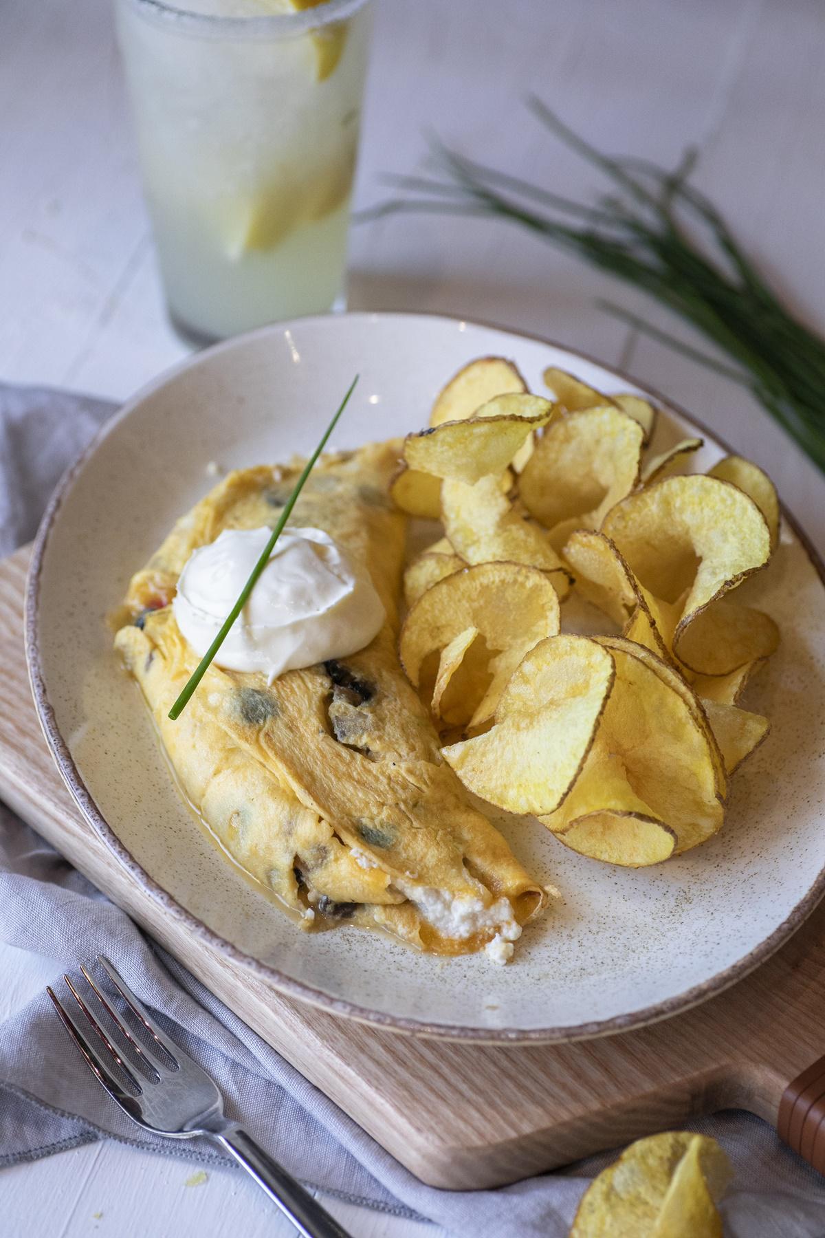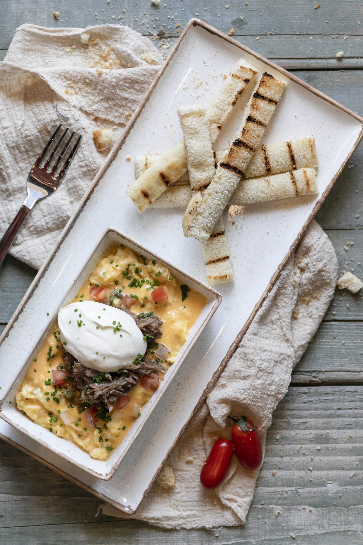 Η πραγματική μάχη όμως είναι εκείνη των αυγών. Τα οποία αποθεώνονται με όλους τους ωραίους τρόπους. Μια πεντανόστιμη ομελέτα με σωταρισμένα κρεμμύδια, πράσινες και κόκκινες πιπεριές, μανιτάρια, ανθότυρο colby, sour cream και πατατούλες! Πεντανόστιμη και χορταστική.