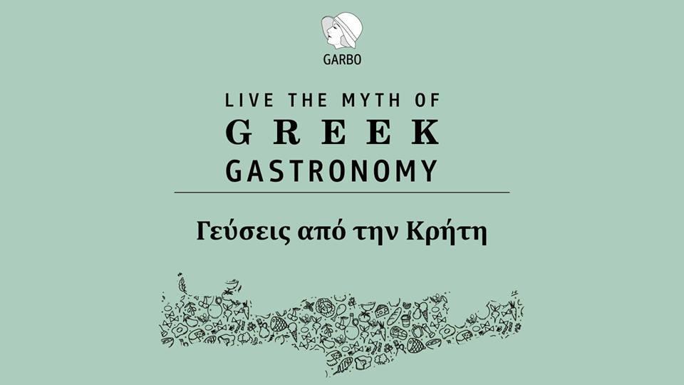 Την Τετάρτη 15 Μαΐου και ώρα 21:00 το Garbo Bar στο πλαίσιο Live the myth of Greek Gastronomy το Garbο ανοίγει τις πόρτες του για ακόμη μια φόρα και σας περιμένει με υπέροχες συνταγές του τεράστιου αυτού γαστρονομικού προορισμού, της Κρήτης. Οι κρητικές γεύσεις και τα κρητικά αρώματα θα είναι οι κύριοι πρωταγωνιστές αυτής της εκδήλωσης.