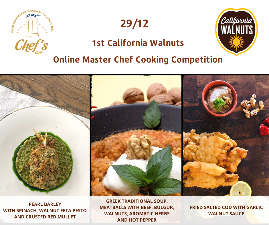 Σημαντική διάκριση στον παγκόσμιο online διαγωνισμό Master Chef, με θέμα τα καρύδια, τον οποίο διοργάνωσε σήμερα, Τρίτη 29 Δεκεμβρίου 2020, η εταιρία California Walnuts, απέσπασαν τα μέλη της Λέσχης Αρχιμαγείρων Β. Ελλάδος Εμμανουήλ Στράτος και Κική Εμμανουηλίδου, καταλαμβάνοντας την 7η και 8η θέση, αντίστοιχα, ανάμεσα στους 10 κορυφαίους chef.