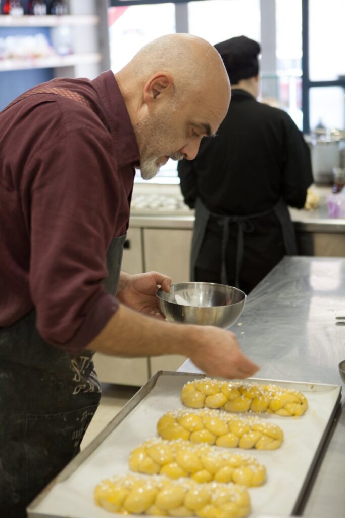Η αρχή γίνεται με τα μελομακάρονα· μια μυστική συνταγή με υλικά εξαιρετικής ποιότητας και βιολογικό ελληνικό μέλι, τα οποία γαρνίρονται με ροζ πιπέρι(!) ή καρύδια. Οι κουραμπιέδες είναι ακόμα ένα χιτ, που πίσω από την ξεχωριστή γεύση τους κρύβεται το blend από κατσικίσια και αγελαδινά βούτυρα, από μικρές ελληνικές φάρμες. Και η λίστα με τις σπεσιαλιτέ δε σταματάει εδώ, πολύ περισσότερο οι επίκαιρες προτάσεις λόγω γιορτών: βασιλόπιτα αργής ωρίμανσης με μπαχαρικά και blend από βούτυρα, ταρτάκια με 19 γεύσεις(!), με σοκολάτες, φρούτα ή πραλίνες, και μαλακά τρουφάκια-μπουκίτσες, που λιώνουν στο στόμα -η αυθεντική γαλλική τρούφα για όποιον γνωρίζει. Οι τούρτες του, βέβαια, αποτελούν ένα ξεχωριστό κεφάλαιο. Ανεπανάληπτοι γευστικοί συνδυασμοί και μικρά μεγέθη, που θυμίζουν αληθινά κοσμήματα.