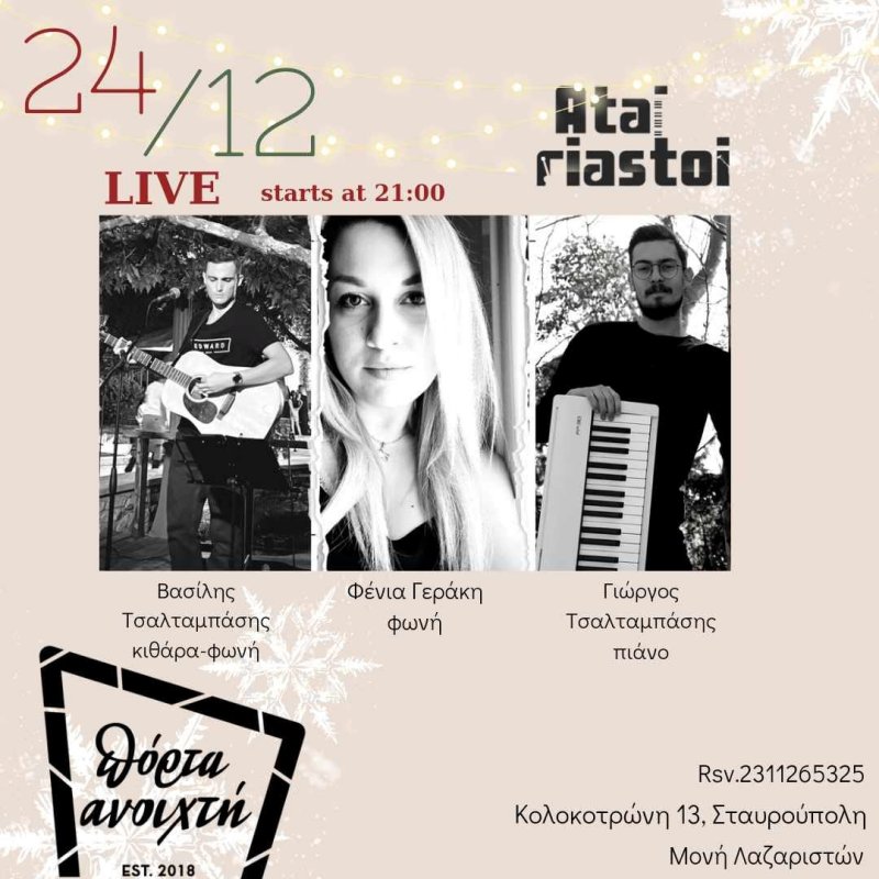*Κυριακή 24 Δεκεμβρίου, στην Πόρτα Ανοιχτή και στον Αυλόκηπο, Κολοκοτρώνη 13, Μονή Λαζαριστών, Τ. 2311265325, από τις 14.30 – 24.30